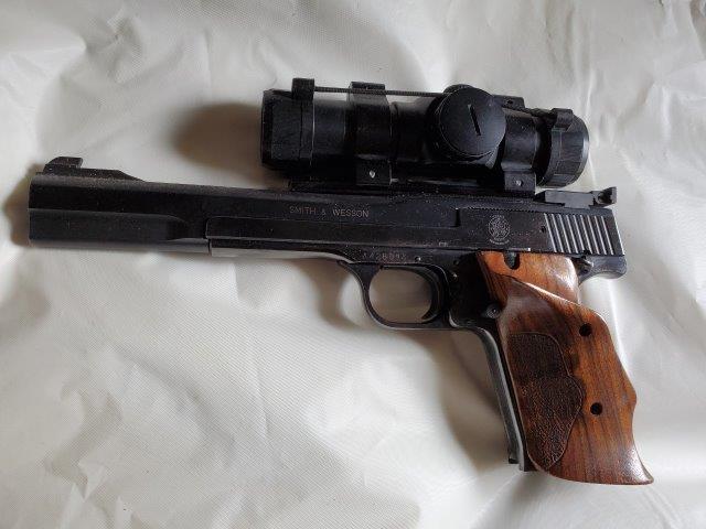 Make: Smith & WessonModel: 41Action: Semi-AutoBarrels: 1Caliber: .22 LRBarrel Length: 7"Overall Length: 10.5"Shot: 0Status: Sold