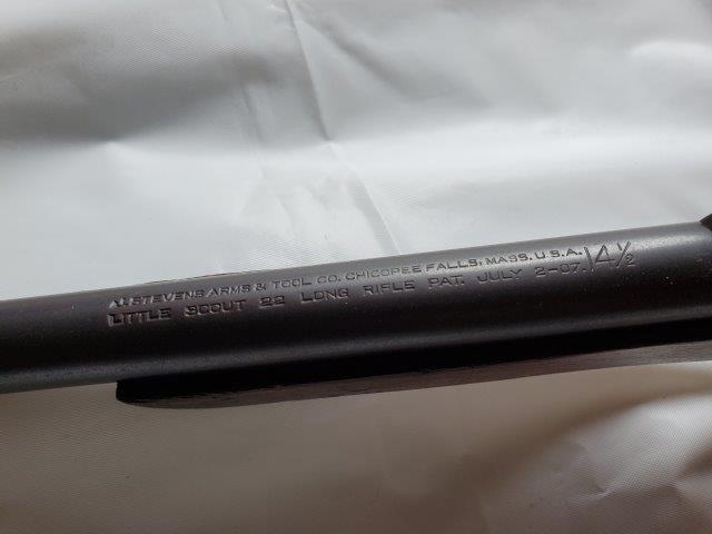 Make: StevensModel: Little Scout 14 1/2Action: UnkBarrels: 1Caliber: .22 LRBarrel Length: 18"Overall Length: 32.5"Shot: 0Status: Appraised