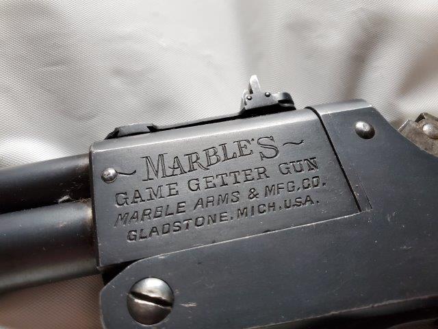 Make: MarblesModel: Game Getter Model 1921Action: BreakBarrels: 2Caliber: .22 S.L.LR & N.R.A / .44 GG & .410 2Barrel Length: 18"Overall Length: 33"Shot: 0Status: Appraised