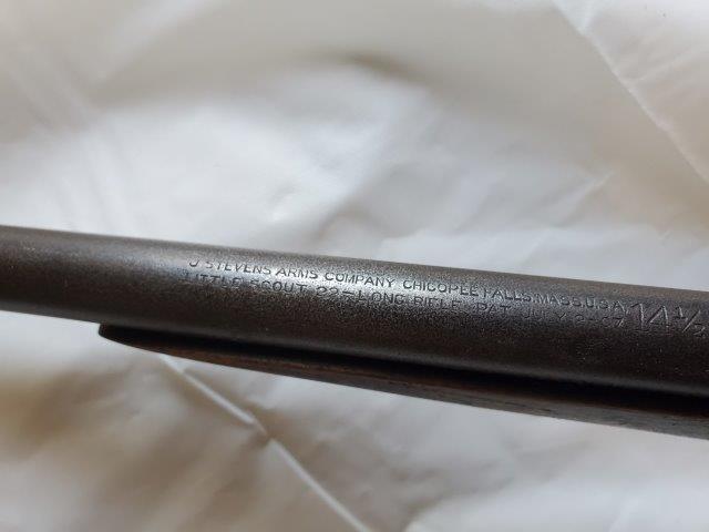 Make: StevensModel: Little Scout 14 1/2Action: Barrels: 1Caliber: .22 LRBarrel Length: 20"Overall Length: 34.5"Shot: 0Status: Appraised