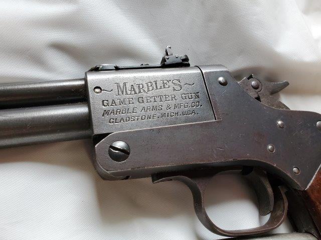 Make: MarblesModel: Game Getter Model 1921Action: BreakBarrels: 2Caliber: .22 S/L/LR & N.R.A / .44 GG .410 2Barrel Length: 18"Overall Length: 33"Shot: 0Status: Appraised
